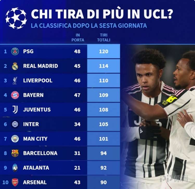 本賽季歐冠射門次數榜:巴黎120次居首 皇馬利物浦二三位