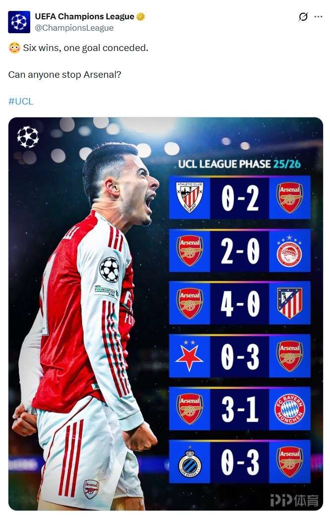 6戰全勝僅失1球!歐冠官方發問:還有誰能阻止阿森納?