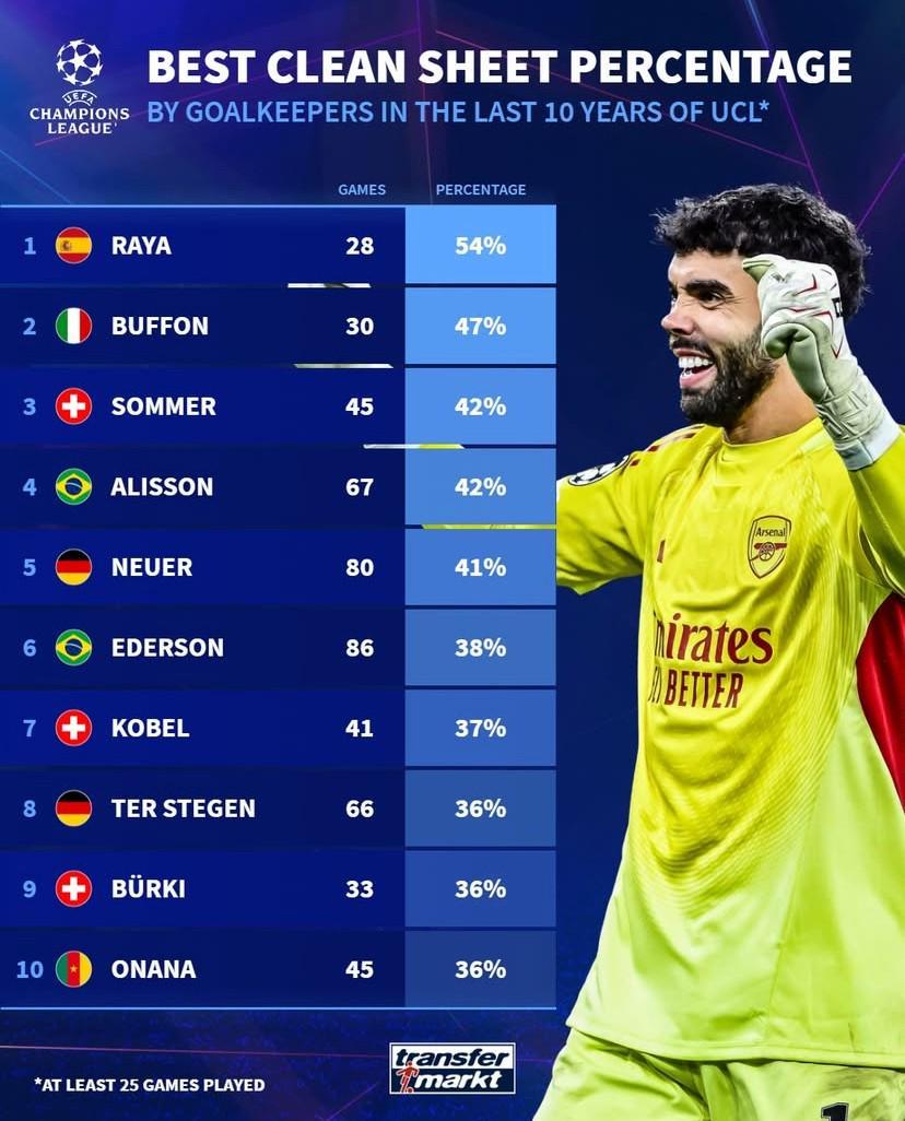 北京時(shí)間12月11日,德轉(zhuǎn)列出了歐冠近10年出戰(zhàn)至少25場(chǎng)比賽的門(mén)將零封率前10,阿森納的戴維-拉亞以54%的零封率高居第一,布馮47%排名第二,索默和阿利松同以42%的零封率并列第三,奧納納36%上榜。