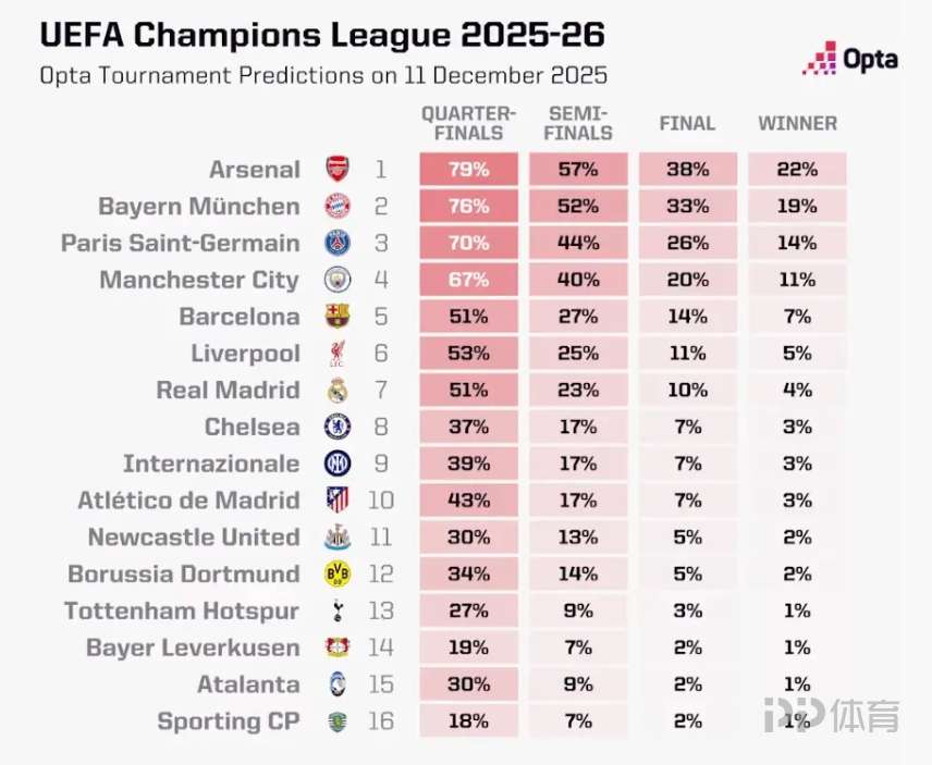OPTA更新歐冠奪冠概率:阿森納22% 拜仁19%