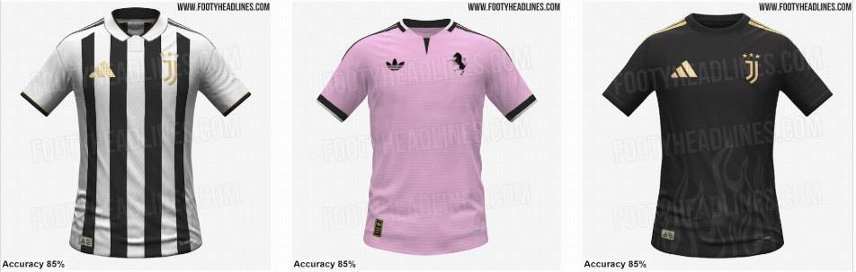 尤文圖斯將在下賽季發布一款非常優雅的主場球衣,以白色、黑色和金色為主色調,并配有Polo領。客場球衣為粉色搭配黑色和白色,第三球衣則為黑金配色。