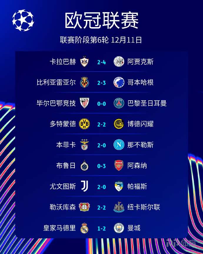 歐冠第6輪對陣全部結束,阿森納6戰全勝領跑,基本鎖定前8席位,曼城升至第4,皇馬跌至第7,本菲卡兩連勝靠近附加賽區,重燃晉級希望。