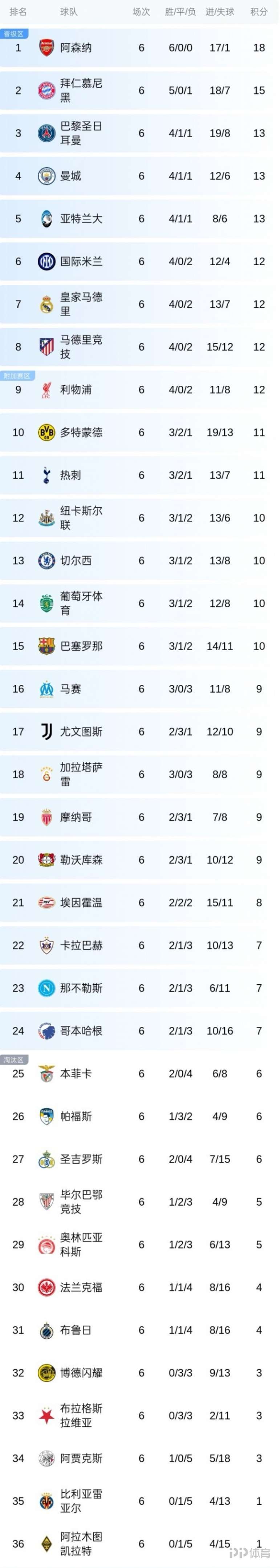 歐冠積分榜:阿森納6連勝領跑 曼城第4皇馬第7本菲卡第25